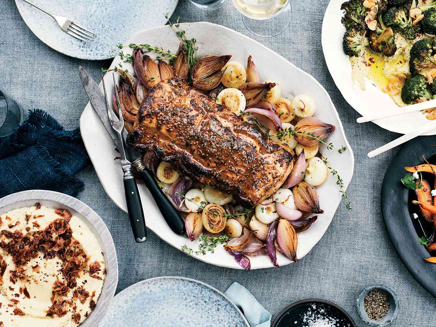 - Slice pork and top with sauce, serve with mashed potatoes and roasted Brussel spouts. *Pro Tip – Roast the spouts in roasting pan under pork loin while cooking. Saves time and dishes.